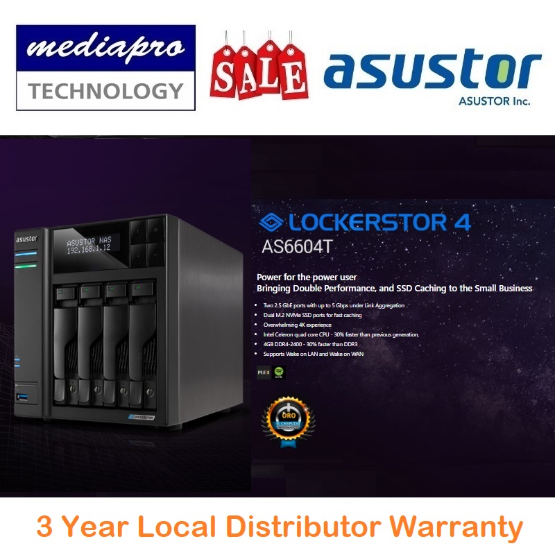 ASUSTOR AS6604T 4-Bay NAS with HDMI Output, Intel Celeron 2GHz Quad-Core Processor (burst up 2.70 GHz) LOCKERSTOR 4 ( without HDD ) - 3 Year Local Distributor Warranty