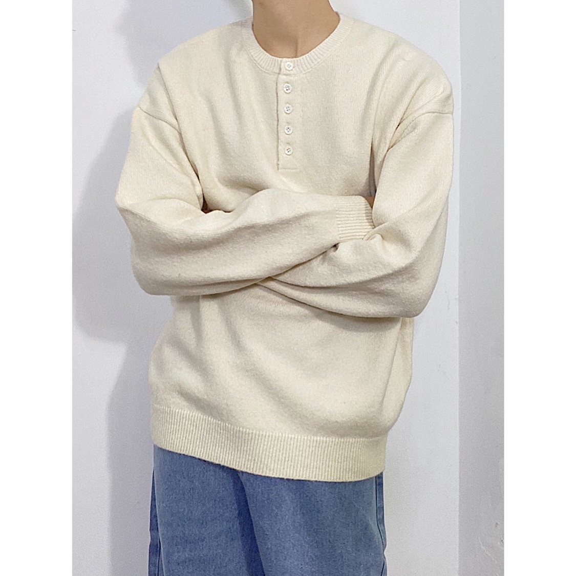 Korean Style Loose Design Open Collar Placket Buckle Lazy Sweater Ins Solid Color round Neck Pullover Knitted Sweater Men