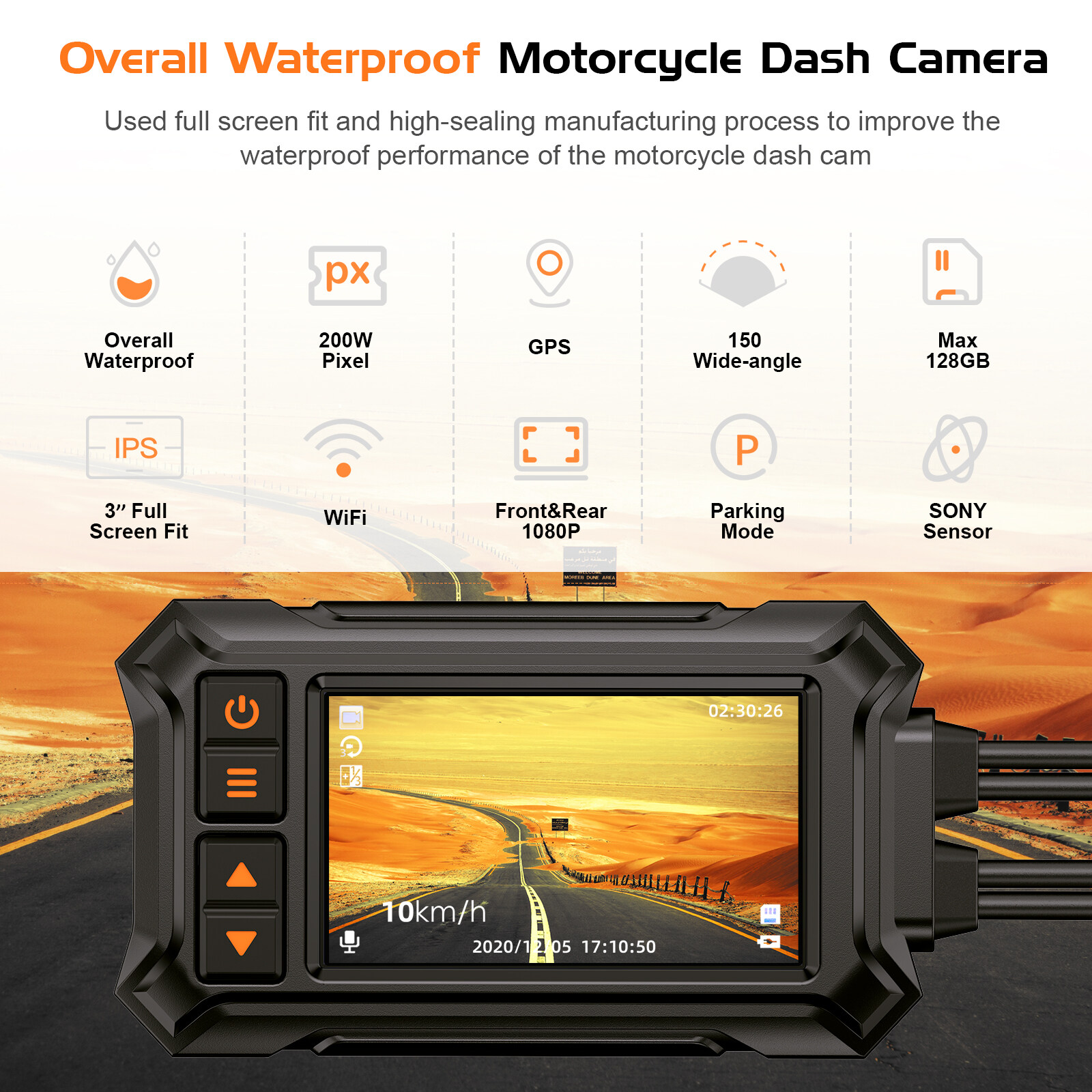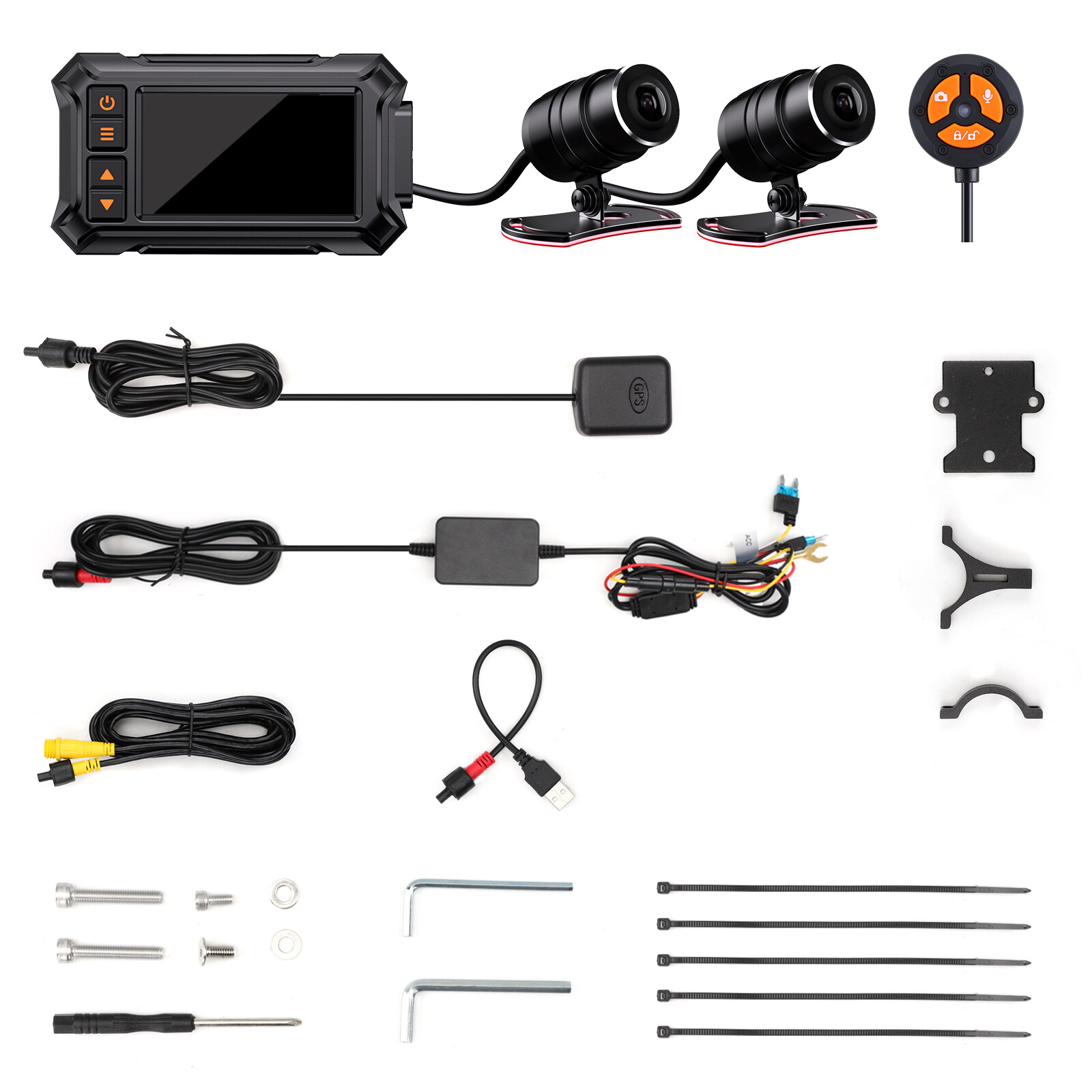Specifications: Chipset:JL5701 Sensor:Double GC2063(6G) Wide lens: Front/Rear lens: 150 degree Video format: MOV/MP4 Image format: JPEG Screen:3.0 IPS WiFi: Support GPS tracking: Support G-Sensor: Support Motion detection: Support Microphone: Yes Speaker: Yes Super capacitor: Yes Manually lock file: Yes Loop recording: Yes Power:5V 2.0A Operating temperature: 5°F~158°F Storage temperature: -4°F ~176°F Support languages: Simplified Chinese/Traditional Chinese/ Japanese English/Russian and so on