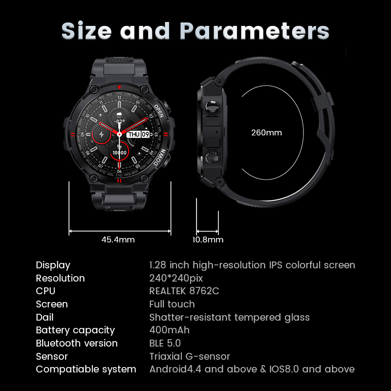 Product description:Model: K22 Smart WatchChip: Realtek8762CScreen: 1.28 inch IPS color Full touch screenOperation method: Full screen touch + buttonBluetooth version: Dual Bluetooth BET4.0+5.0Battery capacity: 400mAhCharging method: Magnetic adsorption chargingStandby time: about 30 dayUsage time: about 5~7 day(Use time is determined by frequency of use. Frequent use will reduce use time)Waterproof level: IP65 waterproof (Note: Please do not use it when swimming and showering)Compatible system: iOS 8.0 version above and Android 4.4 version aboveAPP name: Da FitSupport language: English,Japanese,German,French,Spanish,Arabic,Russian,Ukrainian,Portuguese
