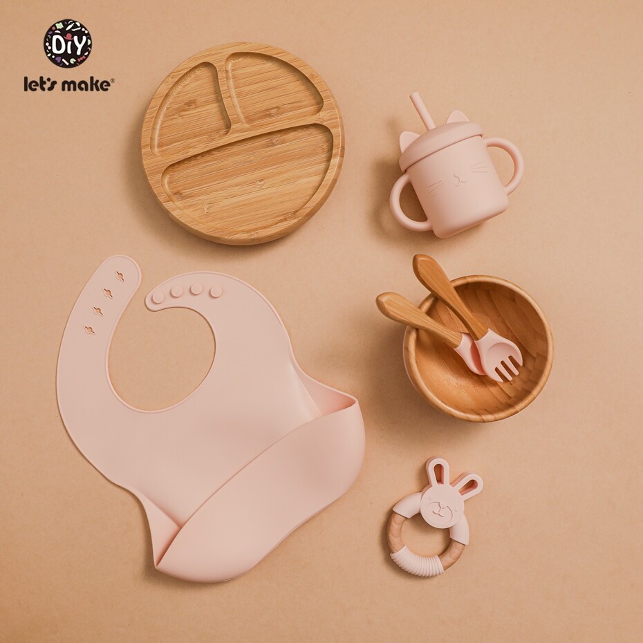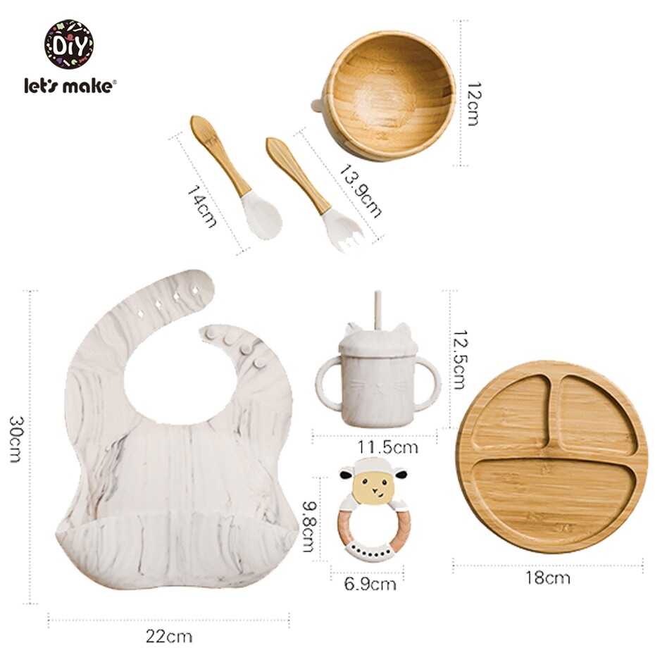 Let's Make Baby Meal Feeding Set 7pcs/set Natural Bamboo Plate,Bowl with Suction 100% Safe Silicone Teether Toy Toddler Gift Set