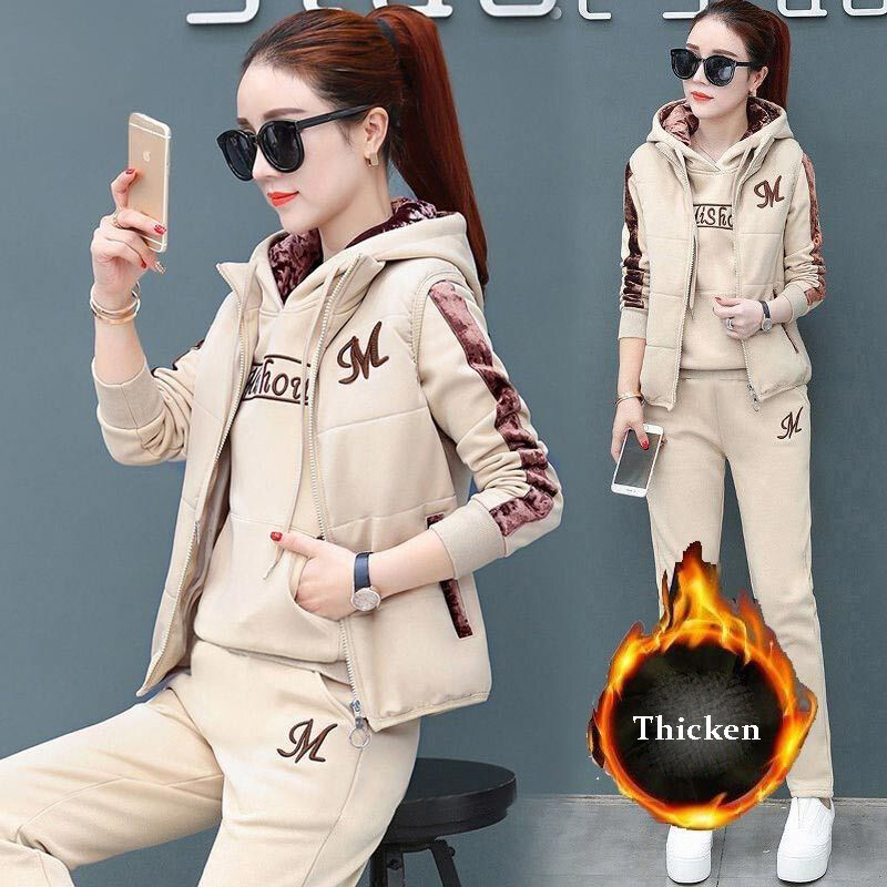 3 Piece Set Women Suit Tracksuit Winter Hoodies+Vest+Pants Track Suit Plus Velvet Warm Sporting Suits Female Clothes