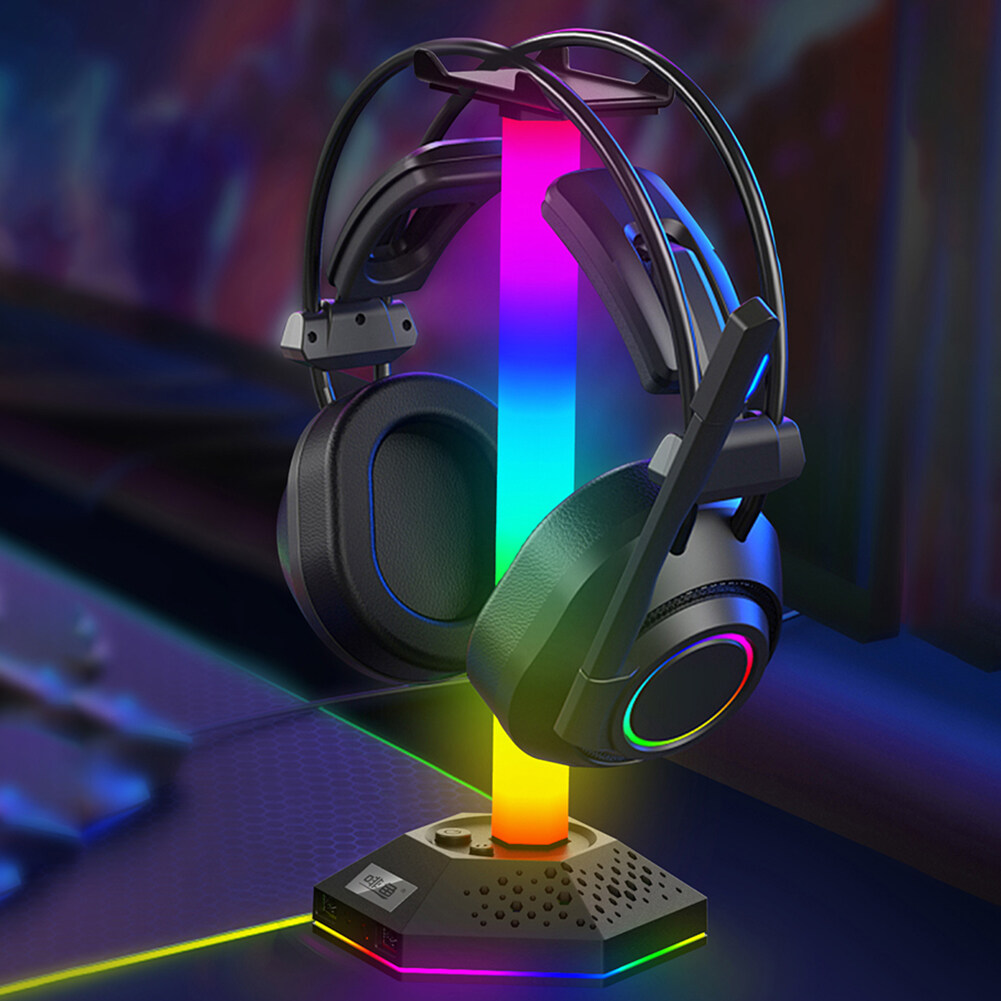 RGB Gaming Headphone Stand 12 Light Modes Headset Holder Bracket Universal Headphones Hanger Hollow Translucent Base Dual USB2.0 Expansion Interface 3.5mm Audio