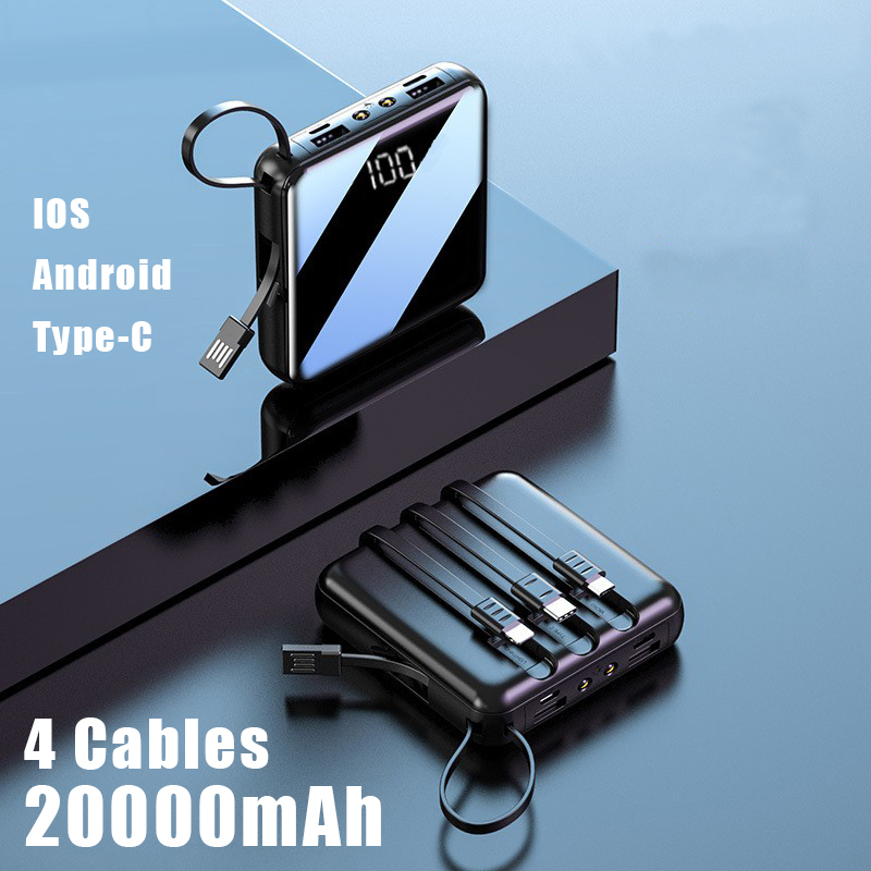 The mini power bank is actually really mini, one is small and easy to carry, very mini, and the other is very beautiful, and its appearance is fascinating. Of course, I know what everyone cares about most is its quality. Such a small body has a large capacity of 20000hAm. The key is that it is also equipped with this 2.1A efficient fast charge. Its little heart is charging. Other power banks are 60% faster and can charge up to 5 electronic devices simultaneously. For everyone's convenience, we have installed four cables in its body, which is convenient for you to use on mobile phones and tablets without charging cables. When the electronic device is charging and needs to be charged, pull the power cord out of its body. After charging, you can put the power cord back into the body. This is convenient for everyone to charge, and will not be stuffed into a school bag or bag. Messy, clean, tidy, would be a pleasure to see. It is indeed the embodiment of high technology. Full mirror capacitive screen, LED display, how much power, two external output, three external output, at a glance. This project comes with wired output, and there are two LEDs on the surface to help you illuminate the road in the dark, easy to use and considerate. Polymer batteries are faster and safer. Introduced smart battery, charging speed increased by 70%