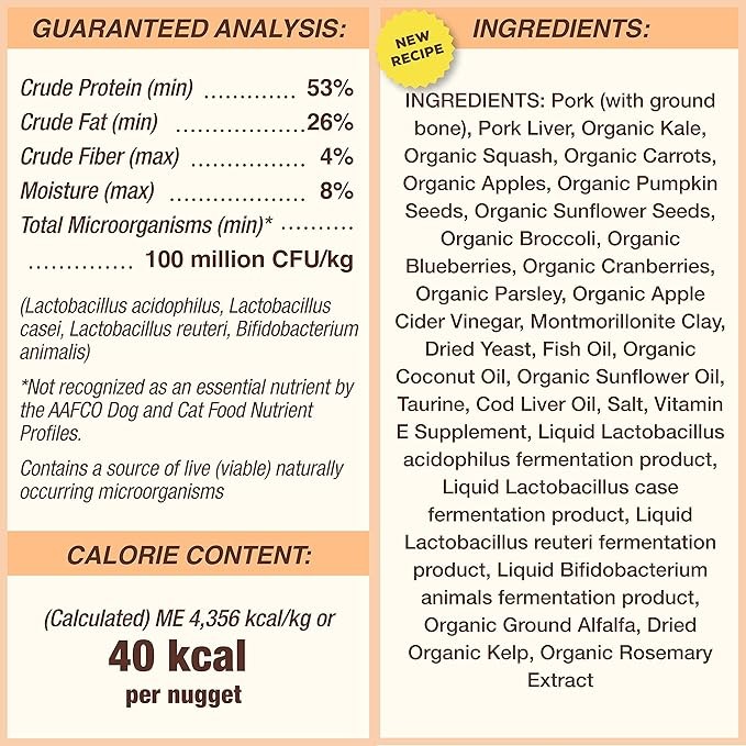 • Premium freeze-dried raw cat food made with crate-free pork raised without antibiotics, steroids or added hormones and with USDA certified organic fruits and vegetables. Grain free